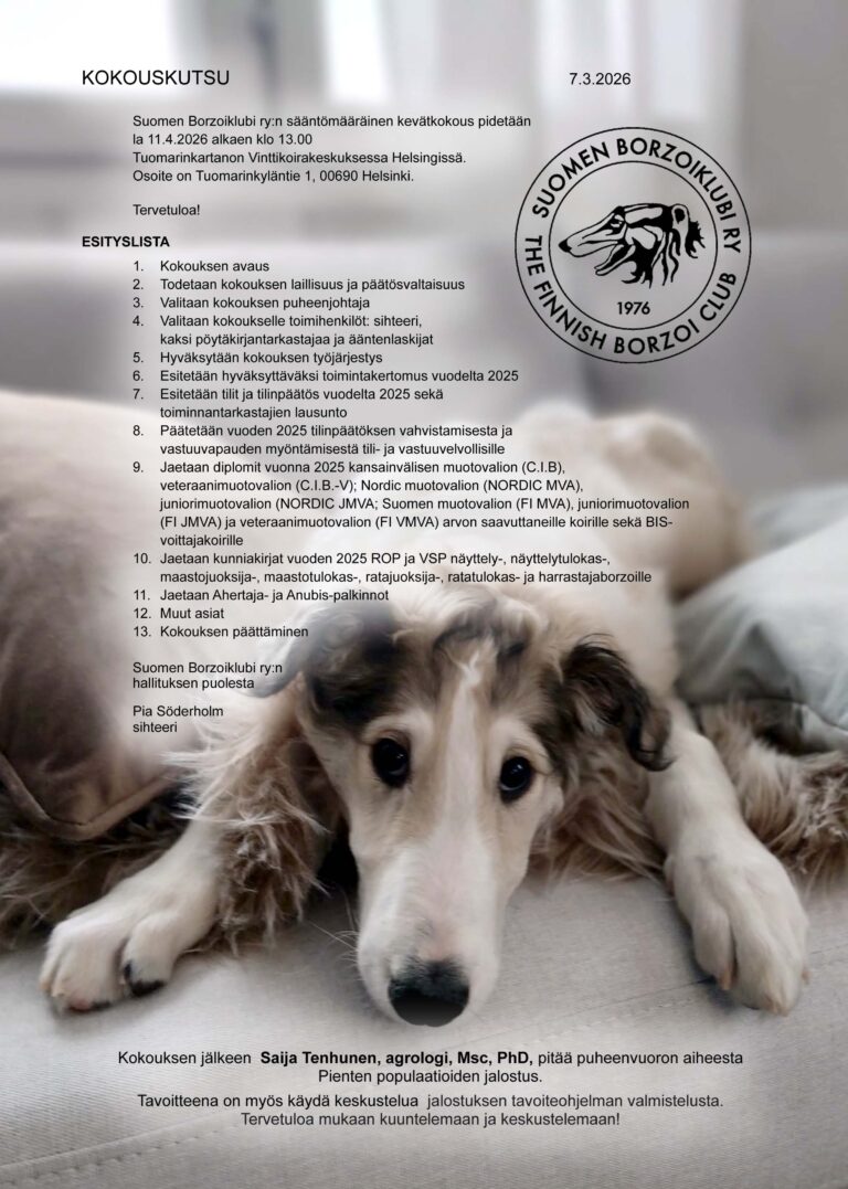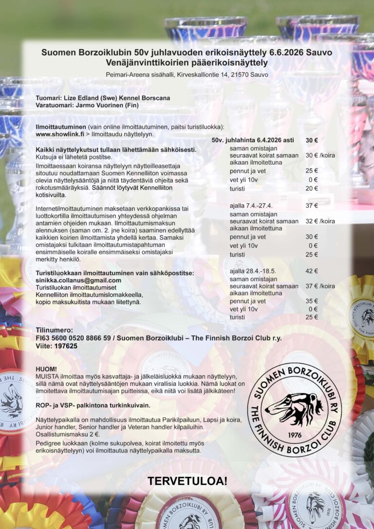 Ensi vuonna vietämme Suomen Borzoiklubin 50-vuotisjuhlaa, jonka kunniaksi kokoamme juhlavuosijulkaisun. Voit tehdä ilmoituksen vakioilmoituslomakkeella (pdf) – Next year, we will celebrate the 50th anniversary of